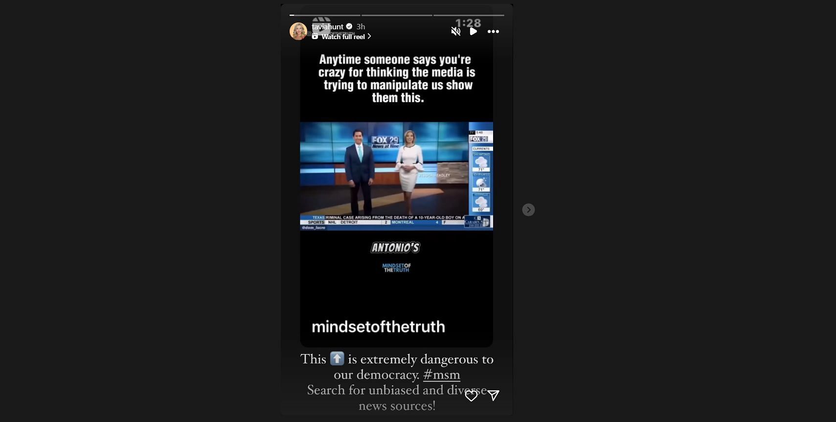 The video, which is more than six years old, features segments from multiple channels throughout America repeating a scripted warning to viewers to stay clear of poorly sourced news. This compilation gained notoriety due to coming off as ingenuine and coordinated. Tavia Hunt reposted this video on her Instagram story with the caption: