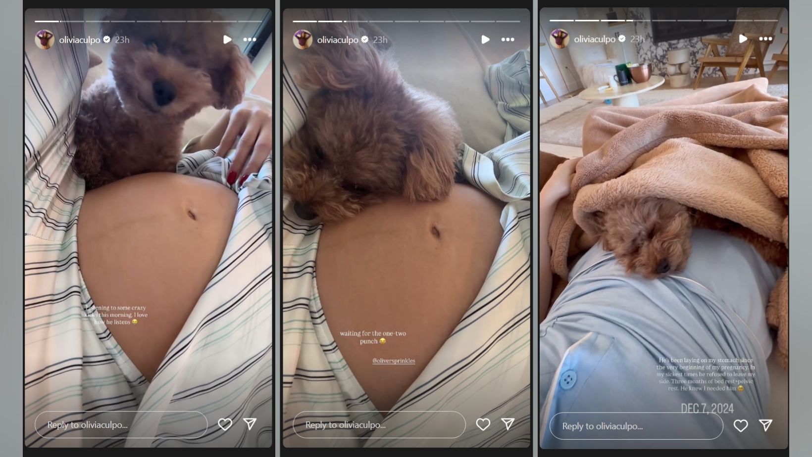 On Thursday, Culpo shared a clip on her Instagram story showing her dog Oliver Sprinkles “waiting” for baby kicks beside her baby bump. Gushing over the sweet moment, she added an adorable caption: