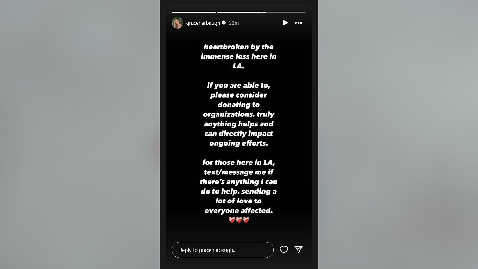 "Heartbroken by immense loss here in LA," Grace's statement read. "If you are able to, please consider donating to organizations. Truly anything helps and can directly impact ongoing efforts."