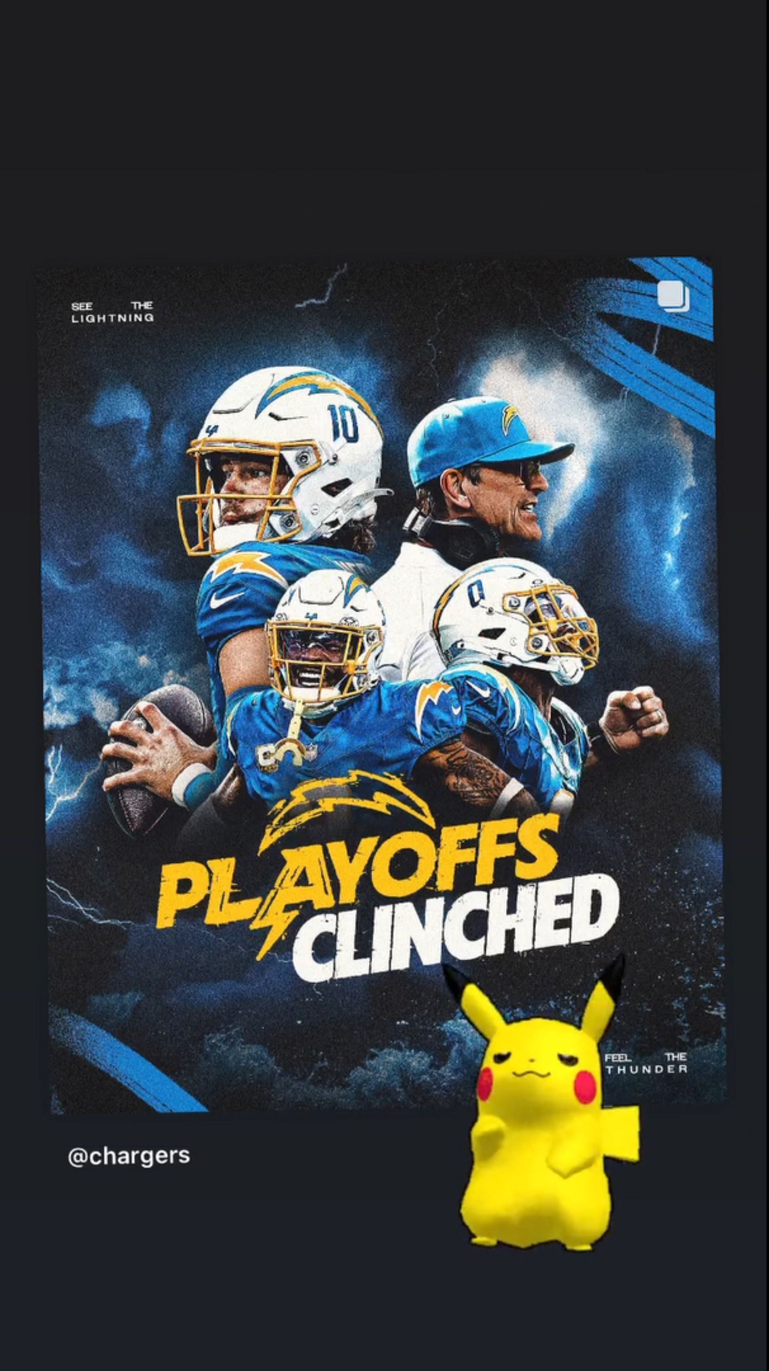 Another Story shows Pikachu triumphantly bobbing his head while lightning crashes around the "Playoffs Clinched" banner: