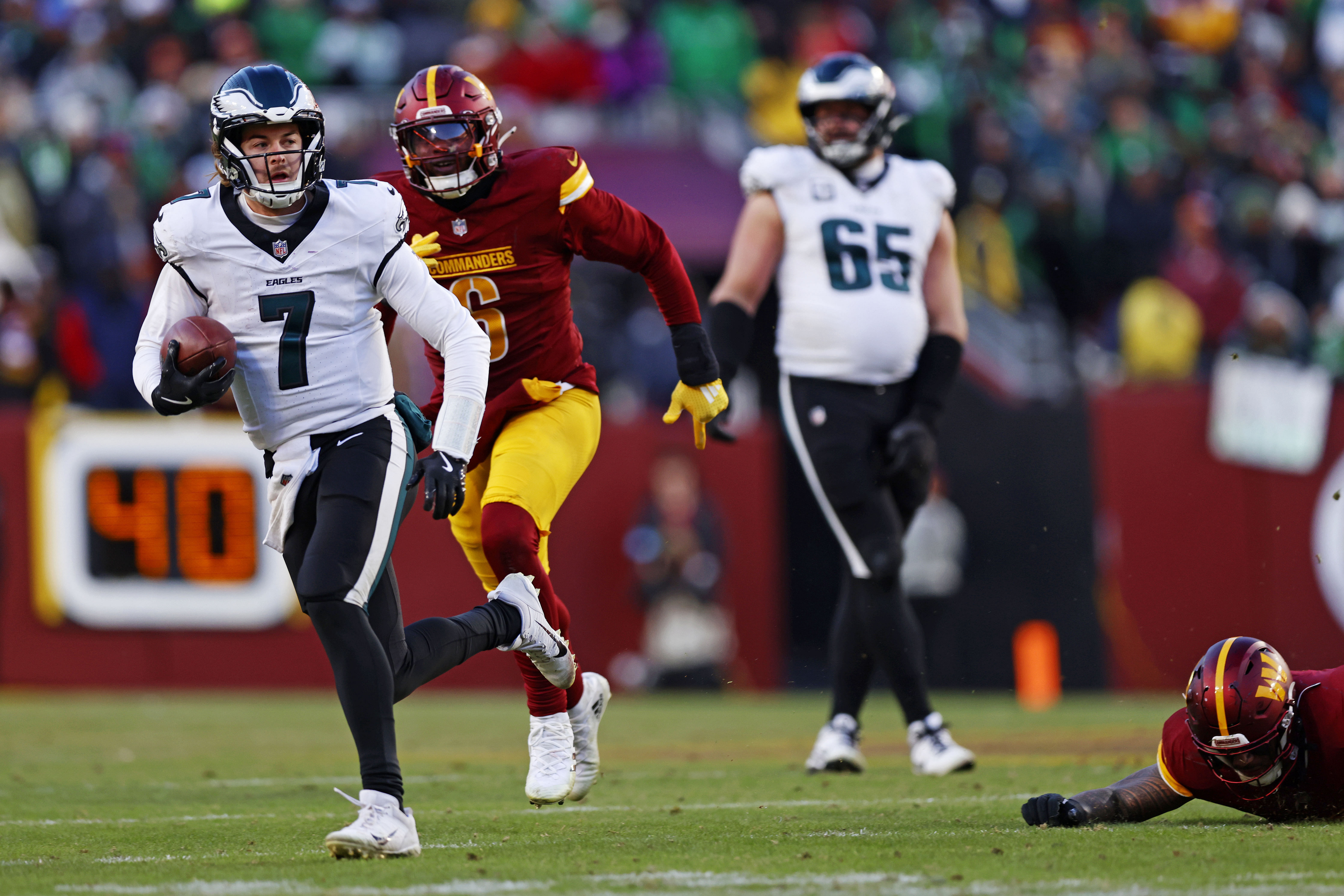 The quarterback swap arrives at a critical moment. The Eagles have run for over 100 yards in all 15 games this season – a club record. Their 2,818 rushing yards lead the NFL and surpass their previous team record of 2,715 set in 2021.