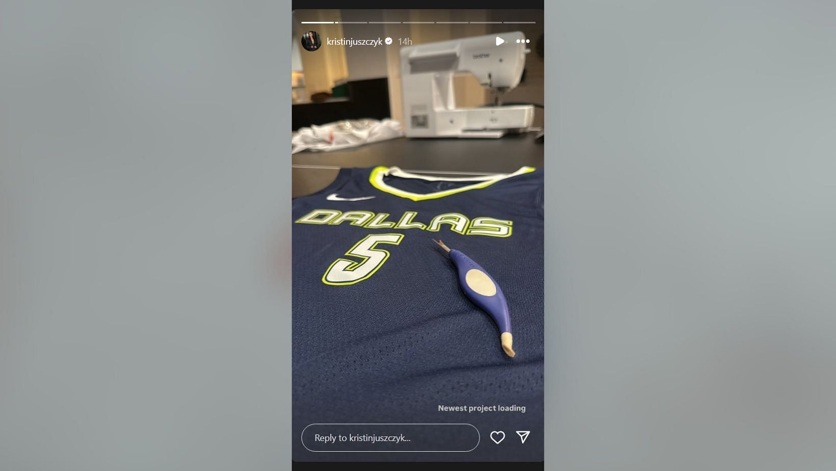 Kristin updated her Instagram story on Monday with a picture of a Mavericks jersey, with her sewing tools in the background. It was the number 5 jersey in navy color with borders in a combination of neon and white shades. Along with the picture, the story included a 3-word message from the designer.