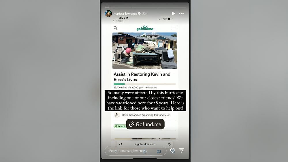 On Monday, Marissa Lawrence posted an Instagram story encouraging fans to donate in the Hurricane Helene relief.