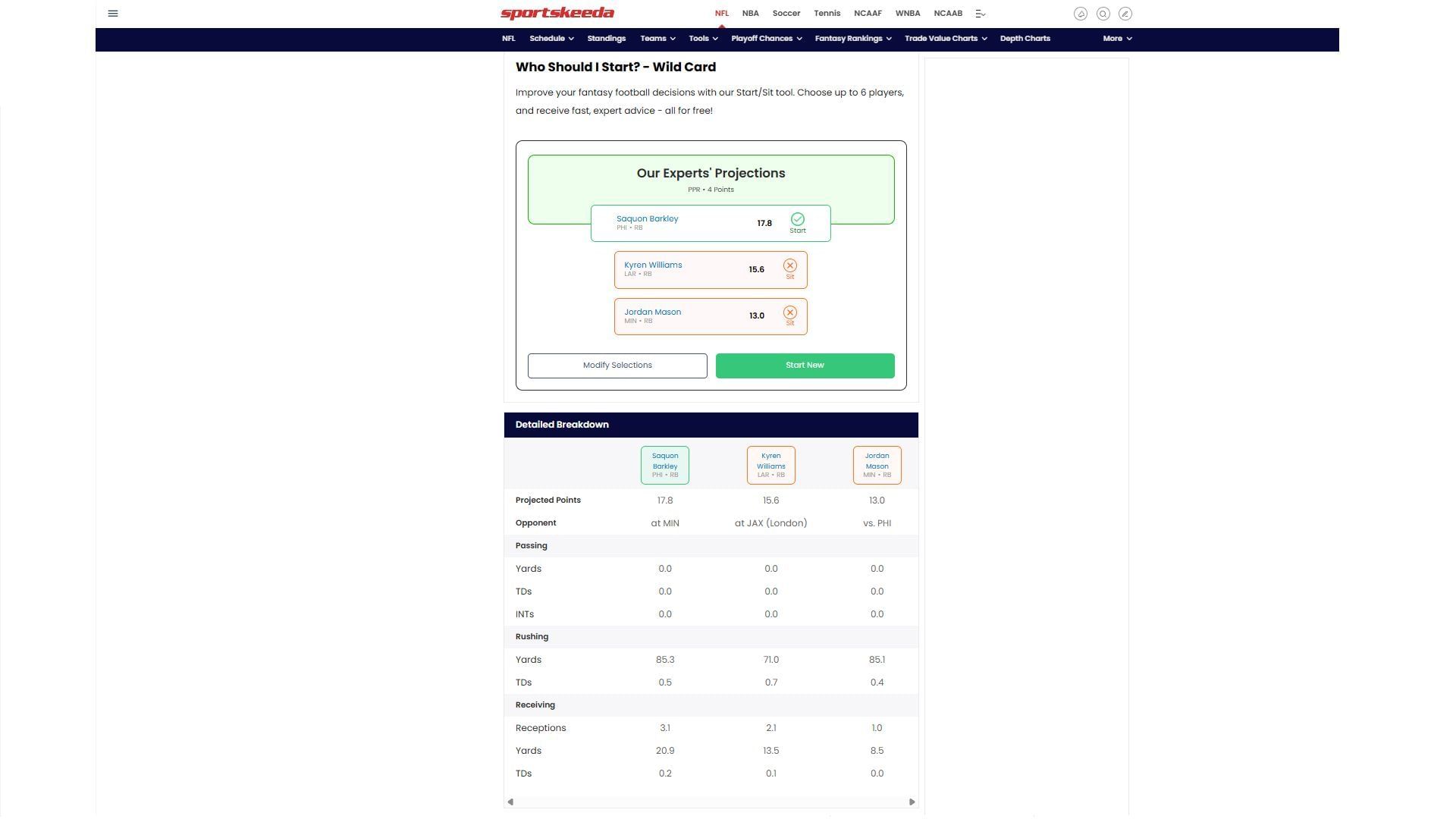 Saquon Barkley hit a rough patch against the New York Giants, but after a mini-bye, he appears to be ready to go. According to Sportskeeda's Who Should I Start Tool, the back is projected to earn 85.3 rushing yards with a 50% chance of a touchdown on the ground.