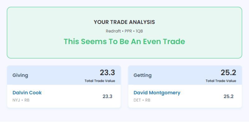 Sportskeeda’s Fantasy Football Trade Analyzer shows that trading Cook for David Montgomery is a fair swap. While Montogomery had 74 rushing yards and a touchdown against the Kansas City Chiefs, the time will come when Jahmyr Gibbs will overtake him on the depth chart.