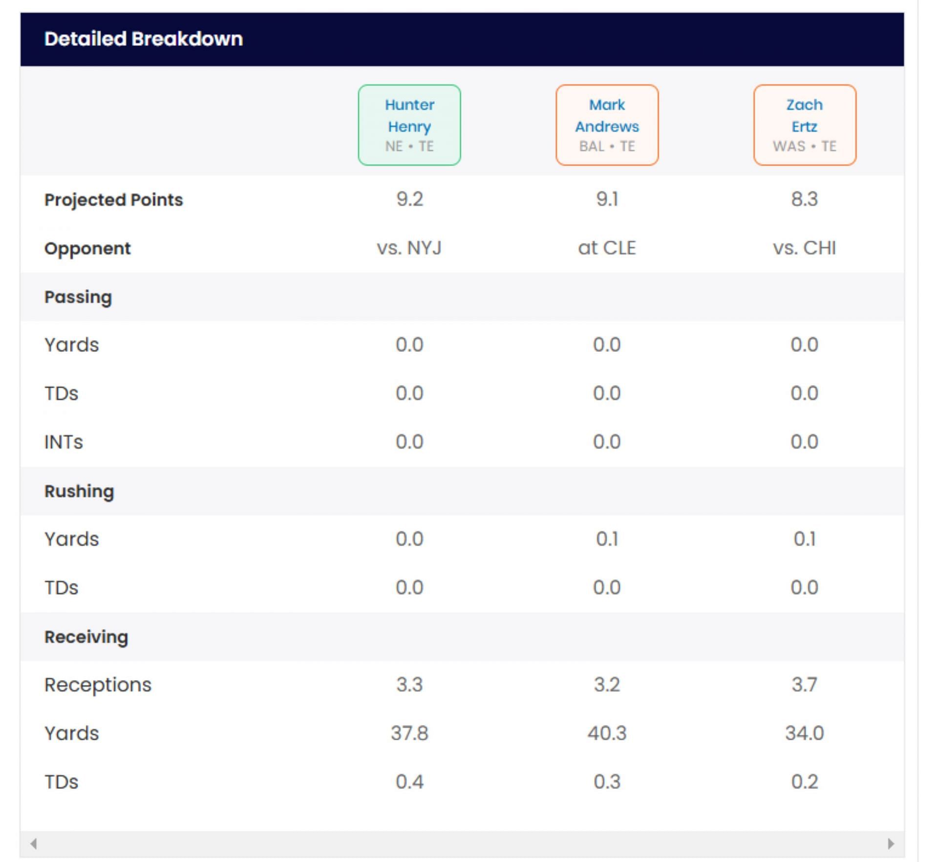 Mark Andrews is the TE16 for Week 8, two spots behind Zach Ertz. The Ravens veteran hasn't been the clear choice at tight end for the Ravens, but he's been productive and a target for Lamar Jackson. He's projected to get three receptions for 34 yards and an 8.16 fantasy points production on Sunday.