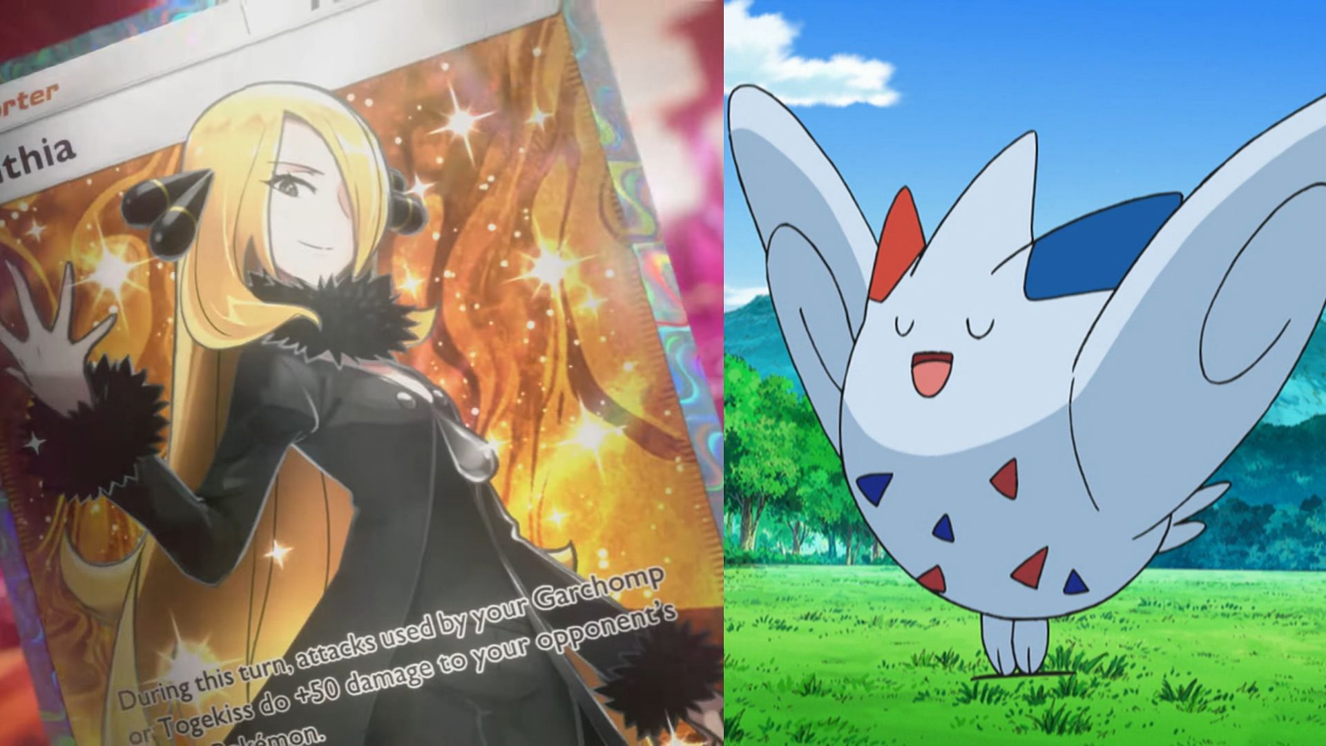 A Cynthia Trainer card, revealed in the trailer, highlights Togekiss’ introduction in Space-Time Smackdown. The card’s description grants Garchomp and Togekiss a +50 damage boost to their attacks during the turn it is used.