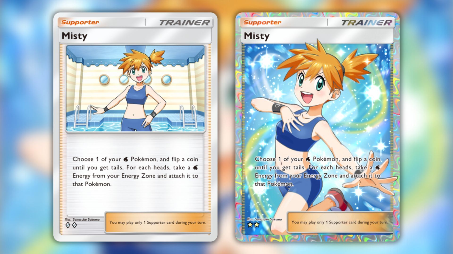 Misty remains a staple in Water-based decks. Her Trainer card allows you to flip coins until you get tails, attaching a Water Energy for each heads to a chosen Water Pokemon. This high-risk, high-reward effect can lead to rapid energy stacking when luck is on your side.