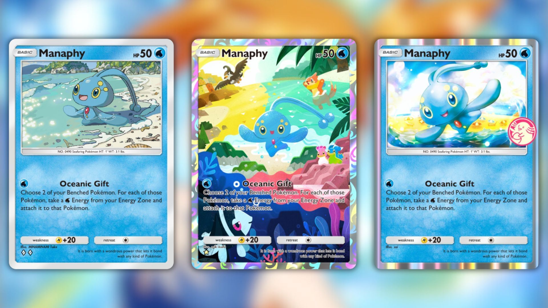 Manaphy offers a dual-target energy transfer. With Oceanic Gift, you can choose two of your Benched Pokemon and attach one Water Energy from your Energy Zone to each.