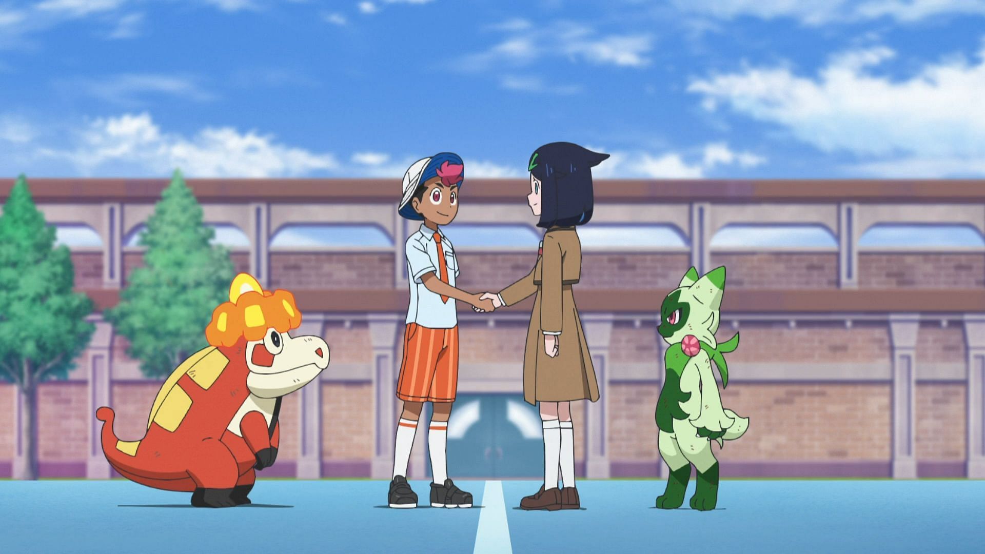 After an earth-shaking explosion, Floragato falls to the ground and faints. Roy and Crocalor celebrate their victory, and Roy shakes hands with his fellow Pokemon Horizons protagonist. The tournament concludes, and Episode 67 jumps ahead to later in the evening, where Ann informs Liko that she's returning to Indigo Academy after her studies in Paldea.