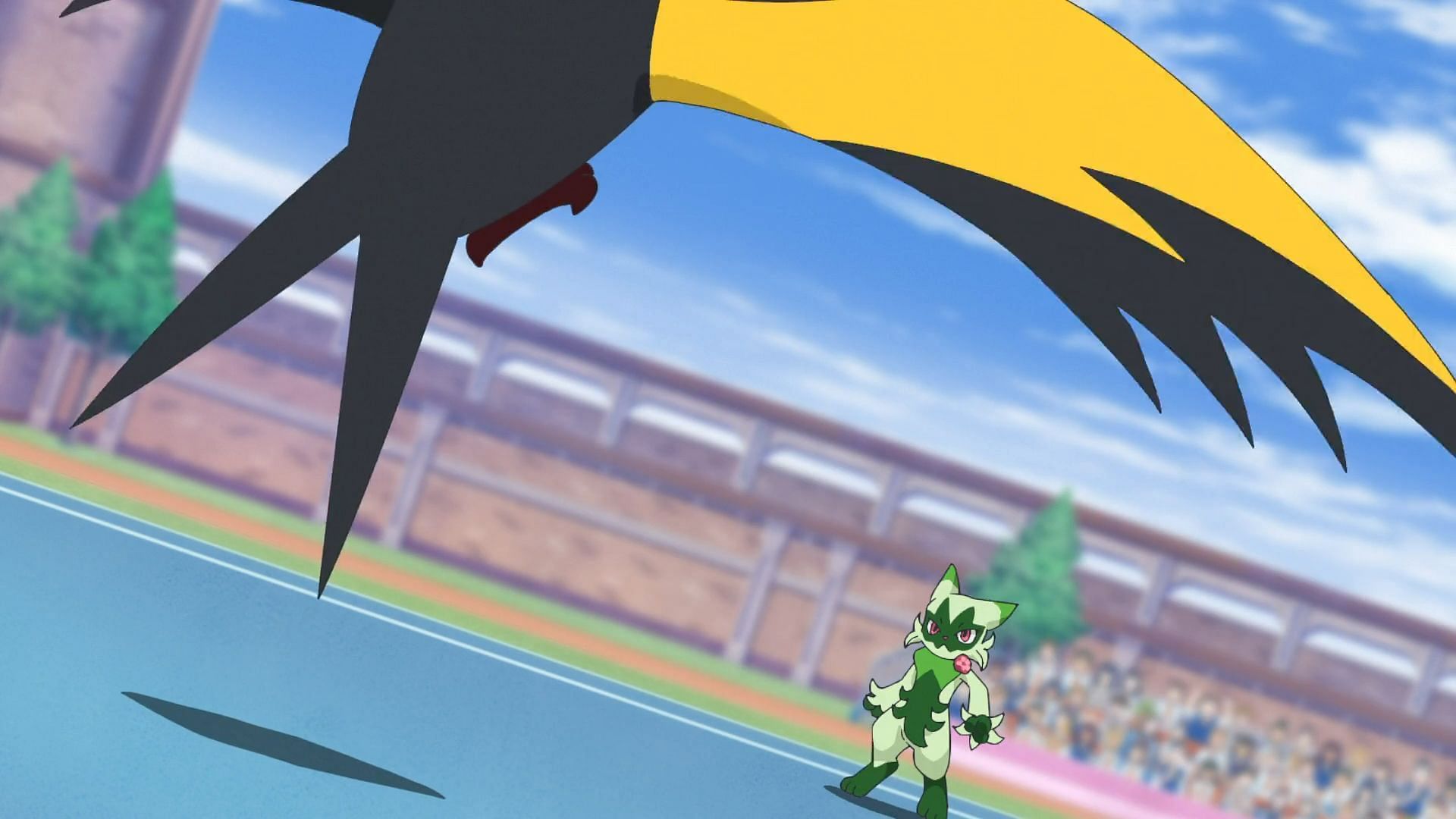 Floragato's vine grabs Kilowattrel, but the Electric/Flying-type Pokemon takes the Grass-type starter flying through the air before divebombing to cause Floragato to crash. Floragato cushions its landing with Magical Leaf as onlookers praise its abilities. Kilowattrel then dodges another Magical Leaf, and its movement in the air causes a buildup of electricity, something that Roy notices.