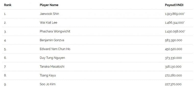 Shin was leading the final table till it came down to last remaining 5 players. Then Edward Yam Chun Ho then took over on the lead. Unfortunately, Benjamin Gonzva had to leave the table in fourth place. At this point, some talks of a 3-way deal started, and the remaining three agreed on the modified payment deal. The new payouts guaranteed Shin VND 1,613,869,000, Lee VND 1,466,314,000, Wongwichit VND 1,430,058,000. After this, Shin eliminated Phachara Wongwichit at the third place and then removed Wai Kiat Lee in the final hand to ship the title and take the biggest piece of the cake.