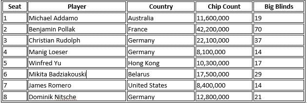 After simultaneous knockouts of two players, Pollak sat with the highest chip count, almost double of Rudolph and the remaining players had very similar chip counts.