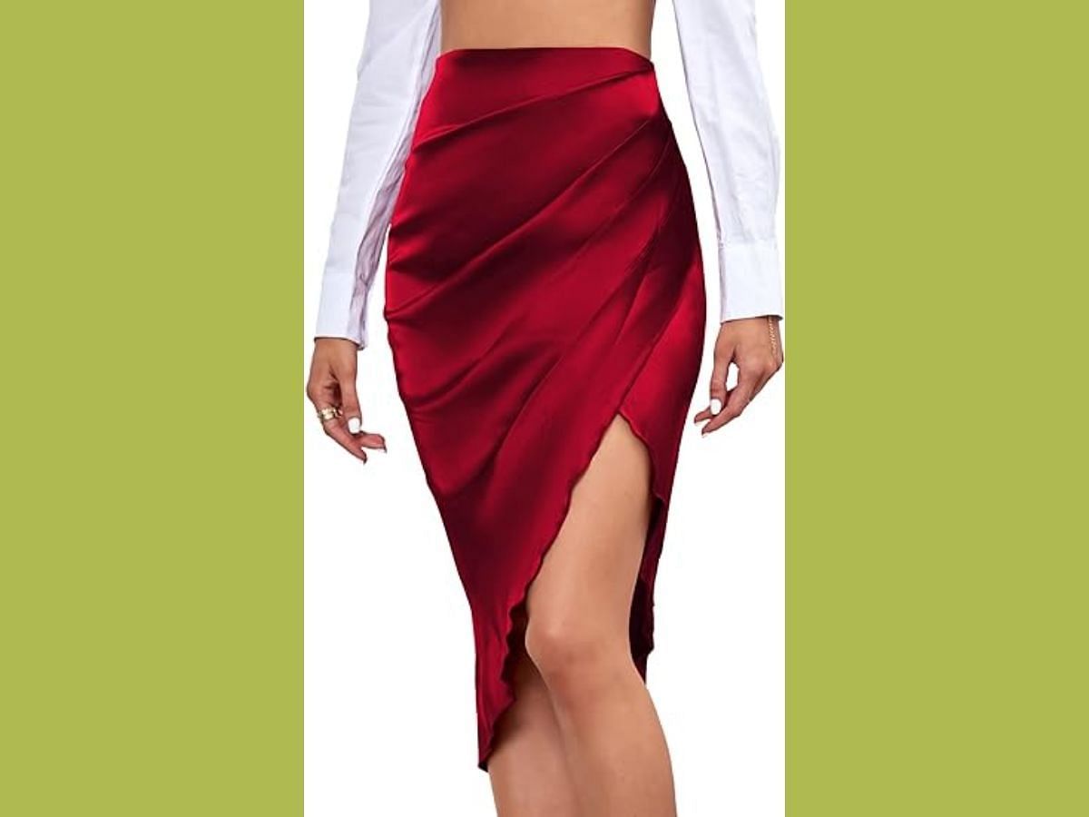 This red skirt is slim fit and knee length, it comes in a solid color, cocktail high waist, and a high split side. Made from high-quality satin silky fabric, the skirt features an asymmetrical split on one side. It is perfect for different kinds of outings and can be hand-washed and machine-washed. It is sold for $24.99 on Amazon.