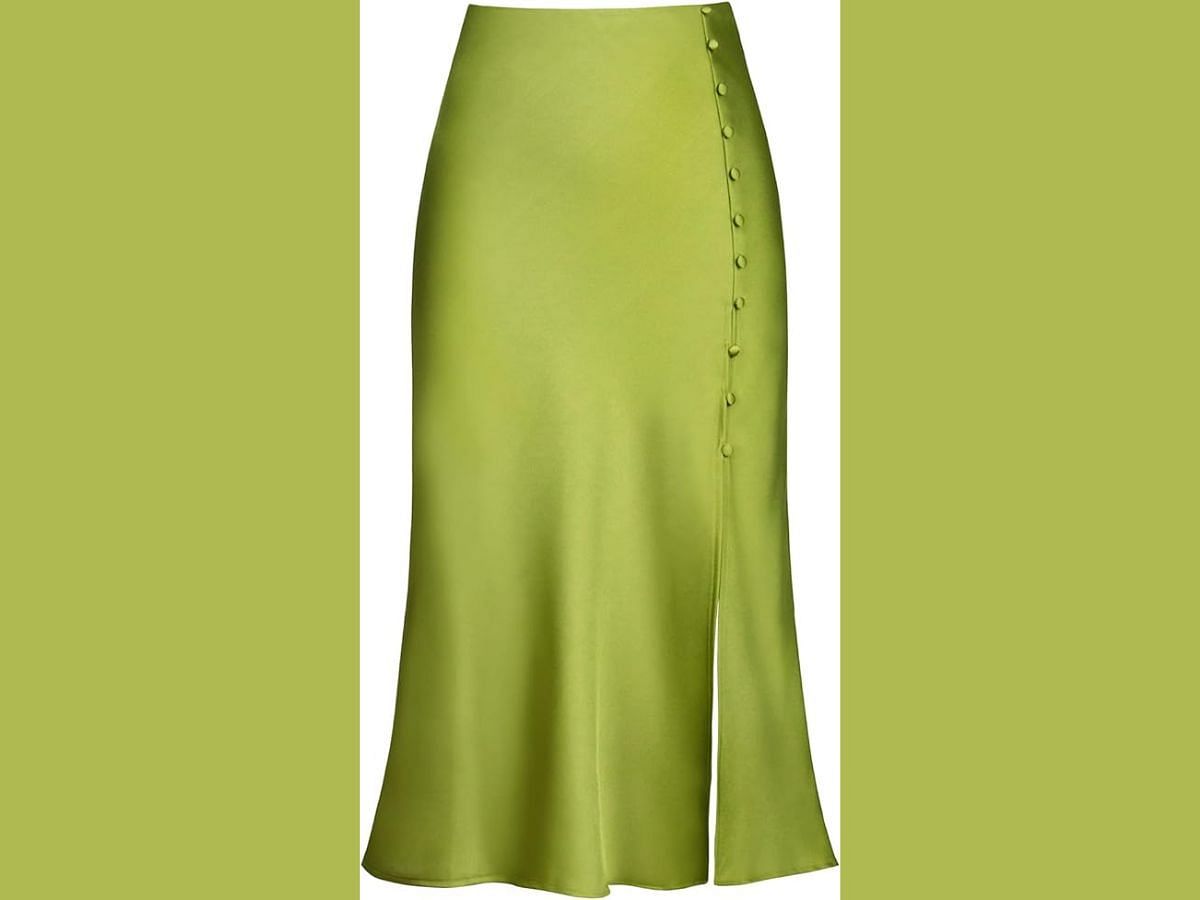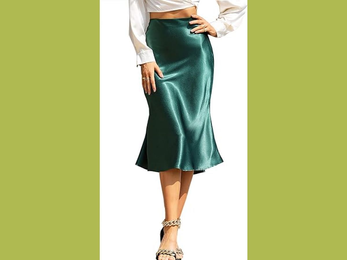 This skirt is made from comfortable, skin-friendly, lightweight, and high-quality satin fabric. It features a long fishtail that reaches the calf, a high elastic waist, a side invisible zipper, a slim fit style, and bias cutting. The green skirt is versatile as it can be paired with any top and worn to any occasion. It comes in different colors and can be gotten from Amazon at $36.99.