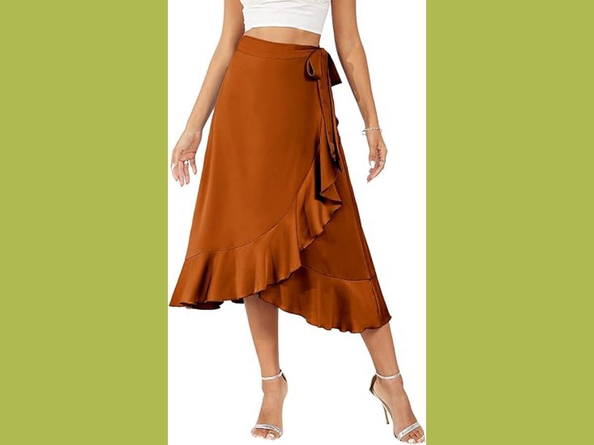 This skirt is a blend of casual and dress-up. Made from high-quality satin silky fabric, this skirt features a self-tie waist, A-line flare, ruffle hem, tulip hem, asymmetrical flowy swing, slit, and solid color. It is to be hand-washed only and comes in a gorgeous caramel color. It is sold for $27.99 on Amazon.
