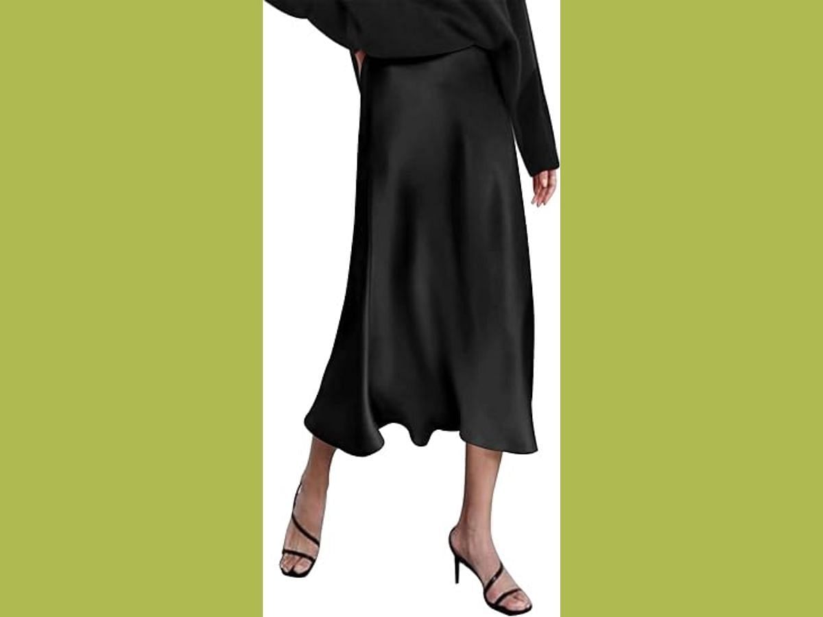The black skirt is made from skin-friendly, breathable, lightweight, and high-quality satin fabric. It features a high waist and is of midi length. The skirt is versatile as it can be paired with different types of tops. It comes in different colors and it is sold for $38.99 on Amazon.