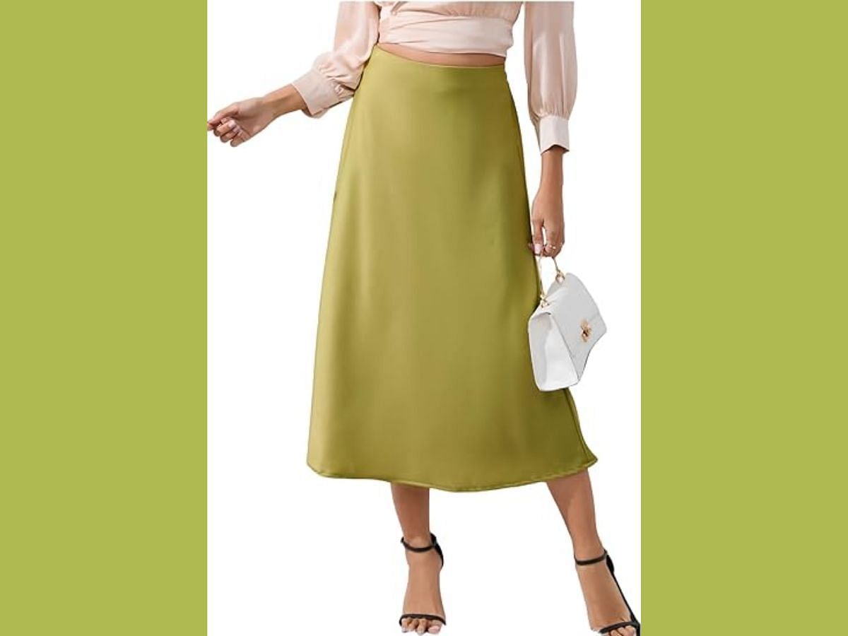 This midi satin skirt is made from high-quality satin fabric with a smooth and shiny sheen. It features an elastic high waist and solid color. The skirt falls and drapes nicely and flatters the hip and legs. It comes in a fruit green color and sells for $29.55 on Amazon.