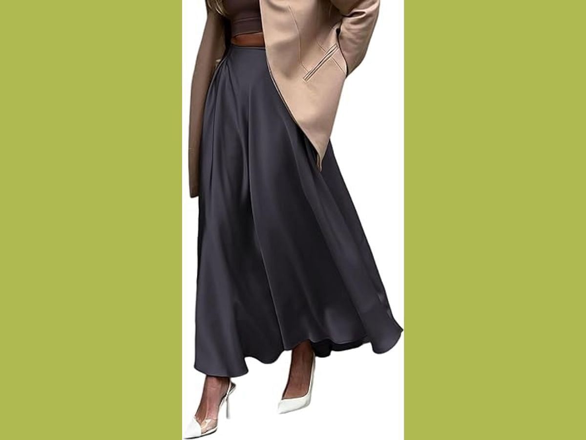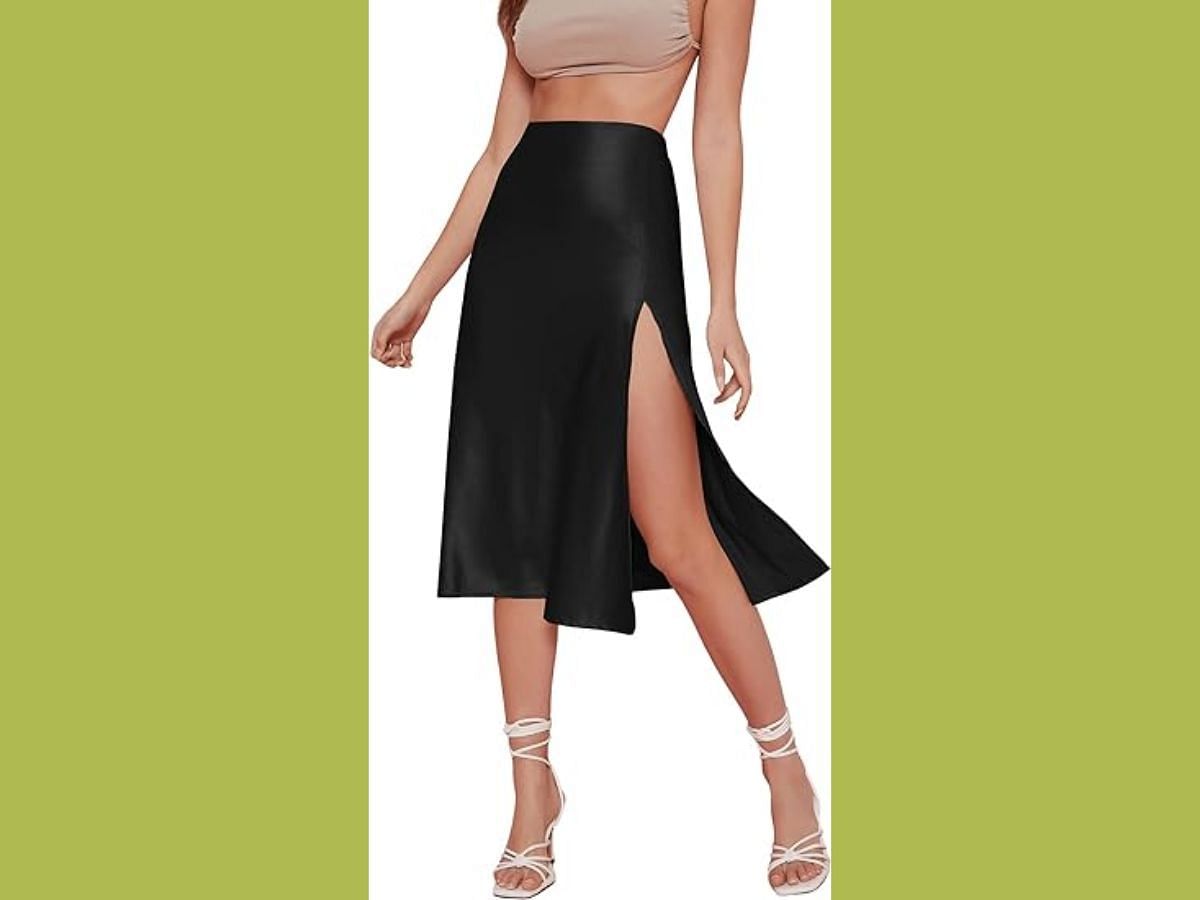 This black skirt is made from high-quality satin silk fabric and it features a thigh-high split, elastic waist, high waist, and midi length. It is suitable for every season of the year, and it can be rocked casually or officially. The skirt sells for $32.99 on Amazon.