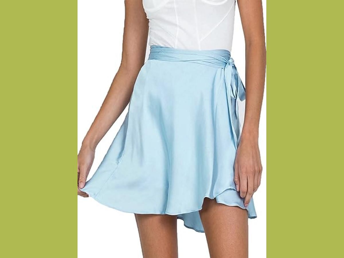 This aqua-blue skirt is perfect for all casual occasions. It features a self-belted closure at the waist, double layers, overlap split, and a flared A-line fit. It is made from shiny smooth silk satin fabric. The skirt is lightweight and skin-friendly. It is sold on Amazon for $20.99.