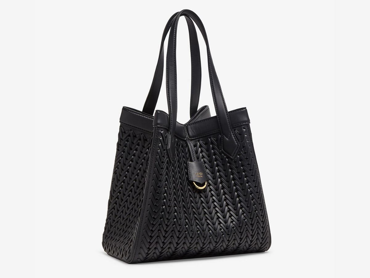 The interlaced leather and trapezoidal shape ensure a sturdy base to carry all your essentials this season. With the help of eight concealed magnets, the bag can be styled as a shopping bag or bucket bag when folded in origami style.