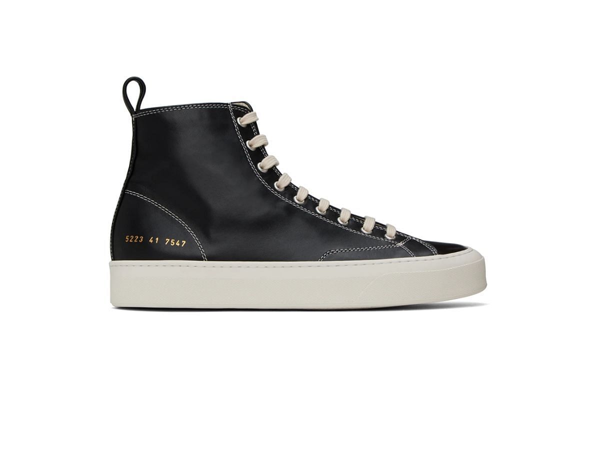 These premium high-top sneakers from Common Projects feature a black top and white soles. The predominantly black upper is accented by white embroidery around the shoe's edges. The iconic golden numbers indicating shoe size and style can be seen towards the shoe's sole. The chunky sole is set in brilliant white, enhancing the black-and-white aesthetic of the shoes. The front lace-up fastening is an ode to the shoe's vintage inspiration, and the round toe ensures comfortability. The shoes are available for 520 US Dollars on SSENSE.