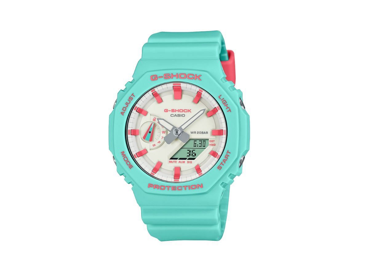 This Casio G-SHOCK watch is a product of collaboration between Rich Brian, a notable singer who made his debut in 2018, and the Japanese electronics company. The watch design is inspired by a guitar that Brian fell in love with in his childhood. It comes in a sea green color with pink accents, and the case back features Rich Brian's signature.