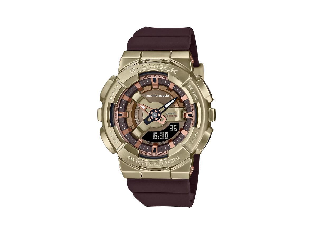 Collaboration with Beautiful People produced this G-SHOCK silhouette. The dial has a multilayered arrangement of detailed components; each finished in a different shade of brown. Its metal bezel is ion-plated in a yellow-gold color, and the strap comes in a deep shade of brown. The Beautiful People logo is featured on the strap, case back, and dial.