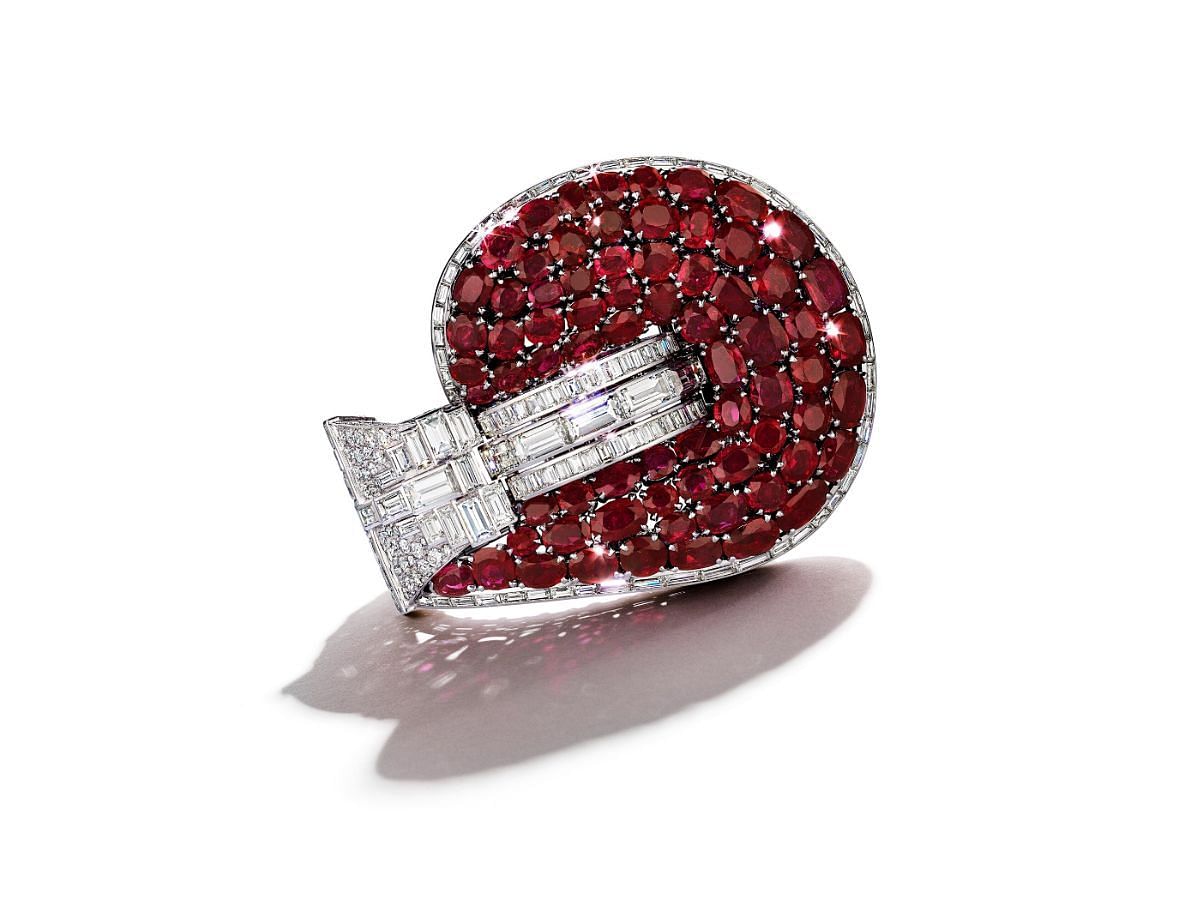 From the Van Cleef and Arpels' 30s collection, this expensive bracelet features multiple-shaped rubies in a red hue, arranged on platinum metal, including baguette diamonds, enclosed by the diamond-encrusted large metallic clasp closure.