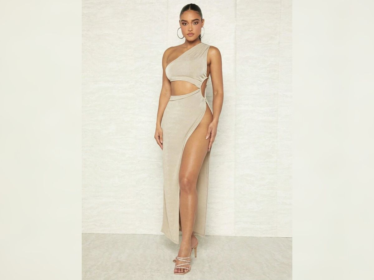 This dress is made from a slight stretch knitted fabric and comes in a khaki nude color. The maxi-length dress features an asymmetrical neckline, cut out at the waist, and a ring-opening on one side. The dress has no sleeves and comes with a long slit from the hit to the hem. The slim-fit dress comes with only one shoulder and flatters the body. It is sold for $20 on the SHEIN online store.