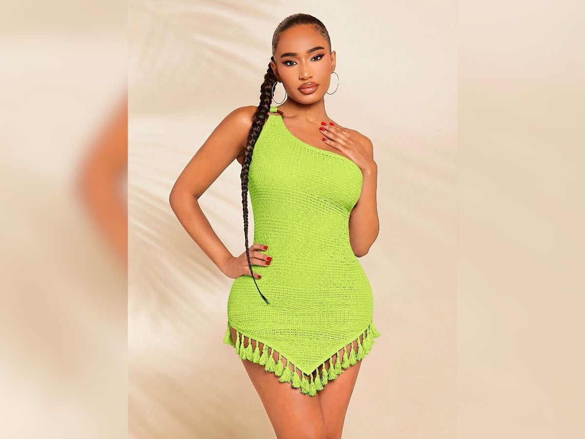 Made from polyester material, this dress comes in neon green and features an asymmetrical neckline and hemline, one shoulder, and no sleeves. The mini-length SHEIN dress has a hemline adorned with tassel trims and has a Boho styling. The dress is sold for $14 on the SHEIN online store.
