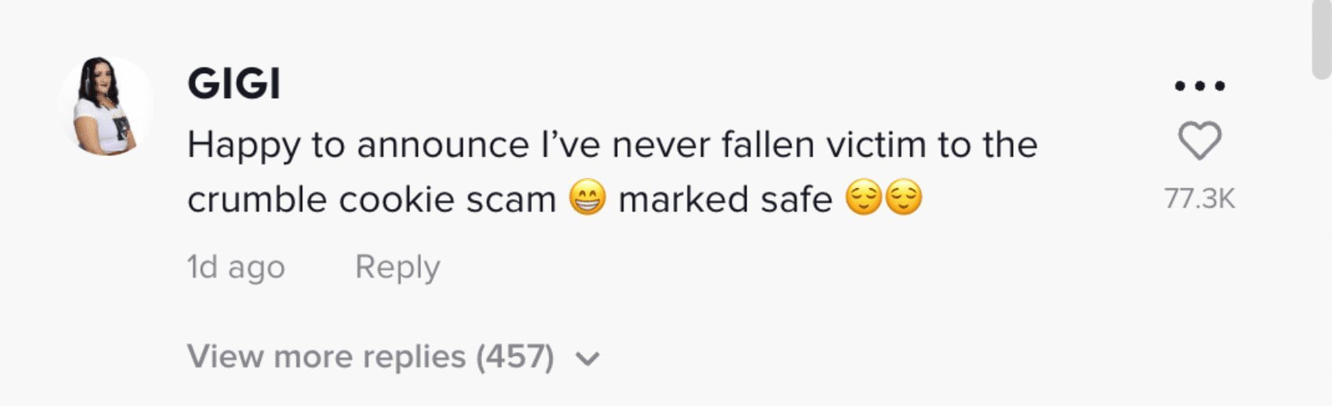 “Happy to announce I’ve never fallen victim to the crumble cookie scam. Marked safe.”