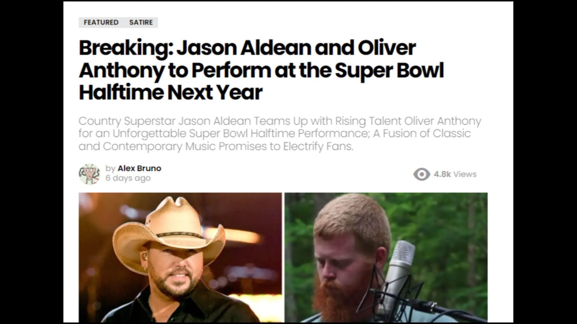 Titled Breaking: Jason Aldean and Oliver Anthony to Perform at the Super Bowl Halftime Next Year, the article was written by an author named Alex Bruno and has since garnered 4.8K views.
