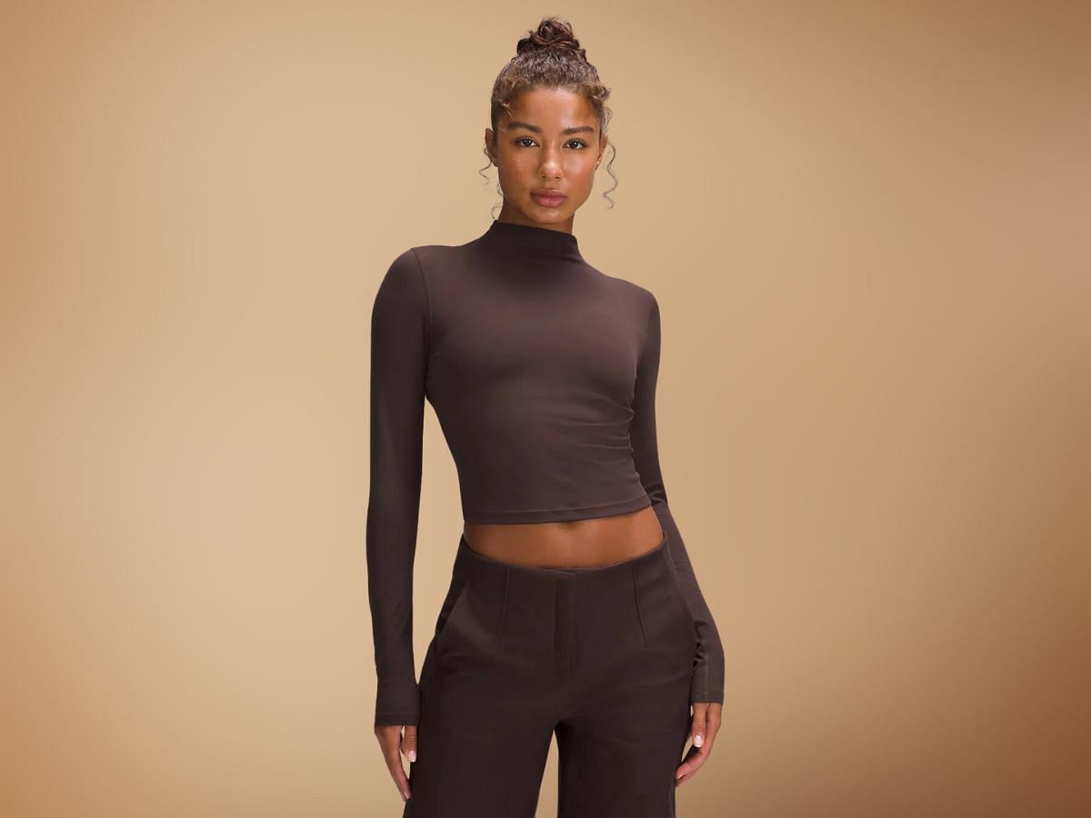 This turtle neck espresso-colored shirt is made from weightless Nulu fabric and features a slim fit and cropped length. It is made from 90% nylon and 10% lycra. Shop for 78 US Dollars on the brand's website.