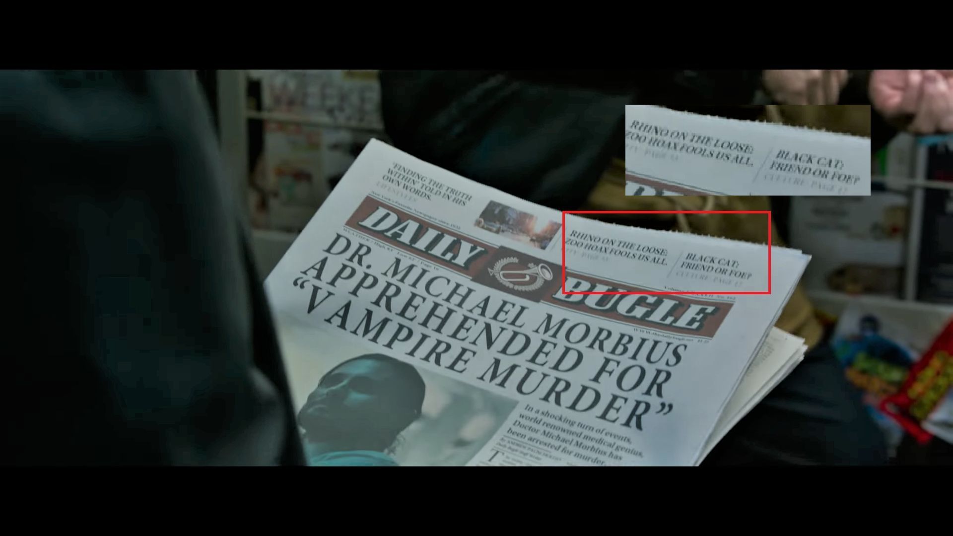 In a prominent shot of The Daily Bugle newspaper featuring Dr. Michael Morbius' arrest, one masthead headline mentioned the superhero Black Cat, while another hinted at the comic villain Rhino.