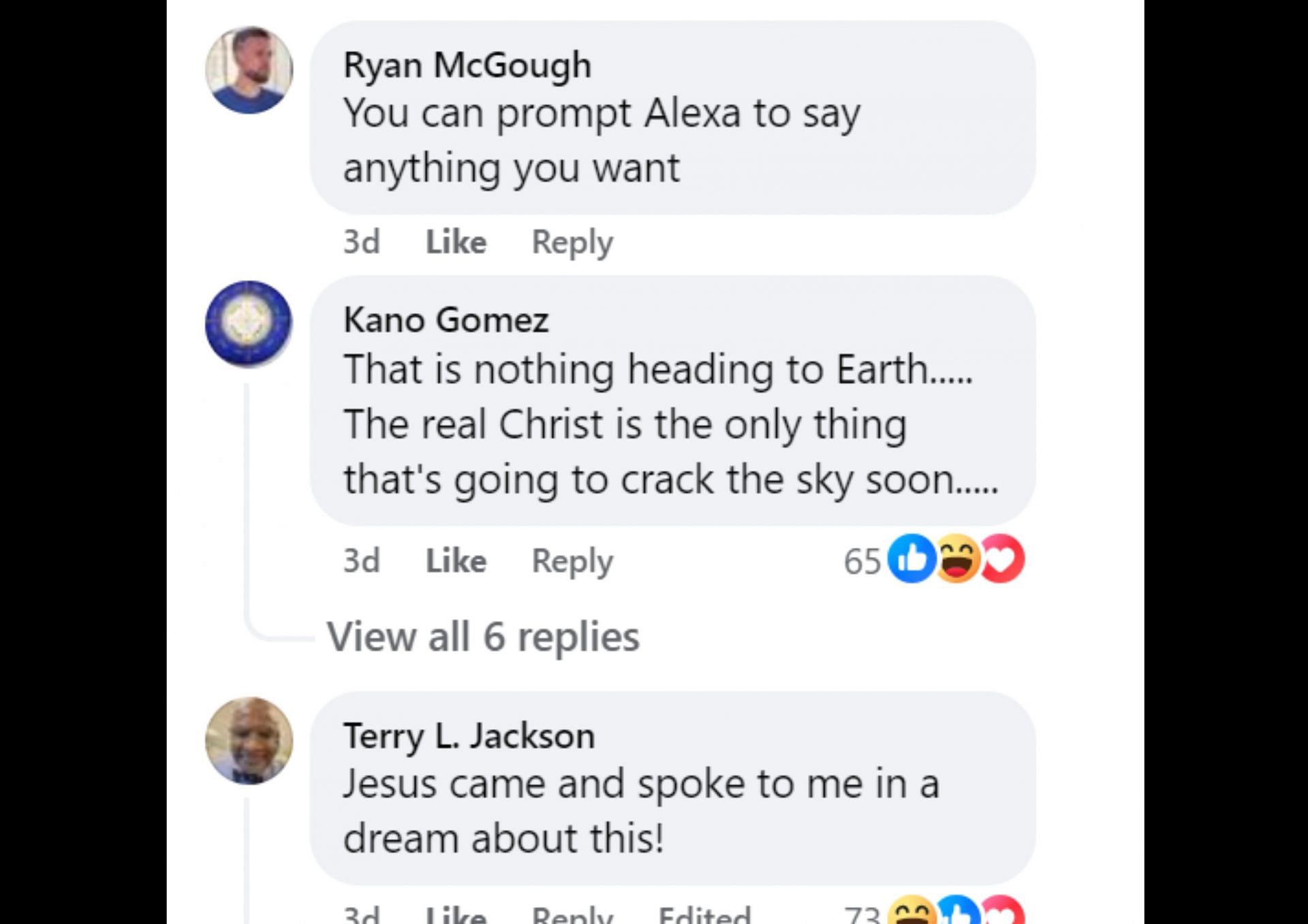 The clip was seemingly posted by user @risirose18 on TikTok and went on to be uploaded by Marcellus Cruse on Facebook. The video started off with a person asking Alexa, “What did the James Webb Telescope detect is coming towards Earth?” The bot claimed that an “armada of alien ships” was making its way to the planet at the speed of light. Alexa also attributed the discovery to Github.io.