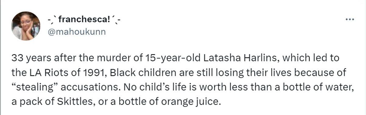 In light of the incident, netizens were reminded of the death of 15-year-old Latasha Harlins, who was similarly killed by a convenience store owner over a bottle of orange juice that cost less than $2. The unfortunate incident occurred on March 16, 1991, just days after the police assault on Rodney King, which in turn fueled the infamous 1991 Watts Riots in Los Angeles.