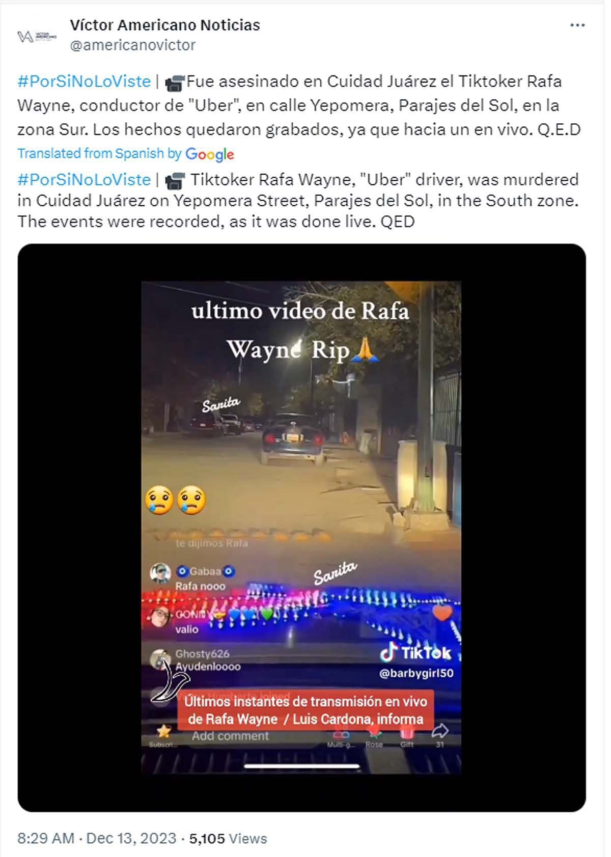 Mexican Uber driver and Tiktoker Jesus Rafael Diaz a.k.a. Rafa Wayne, known for sharing drive-along videos as he drove customers, was robbed and murdered during a live broadcast. The tragic incident occurred late at night on December 11, 2023, near Parajes del Sol in Ciudad Juarez.