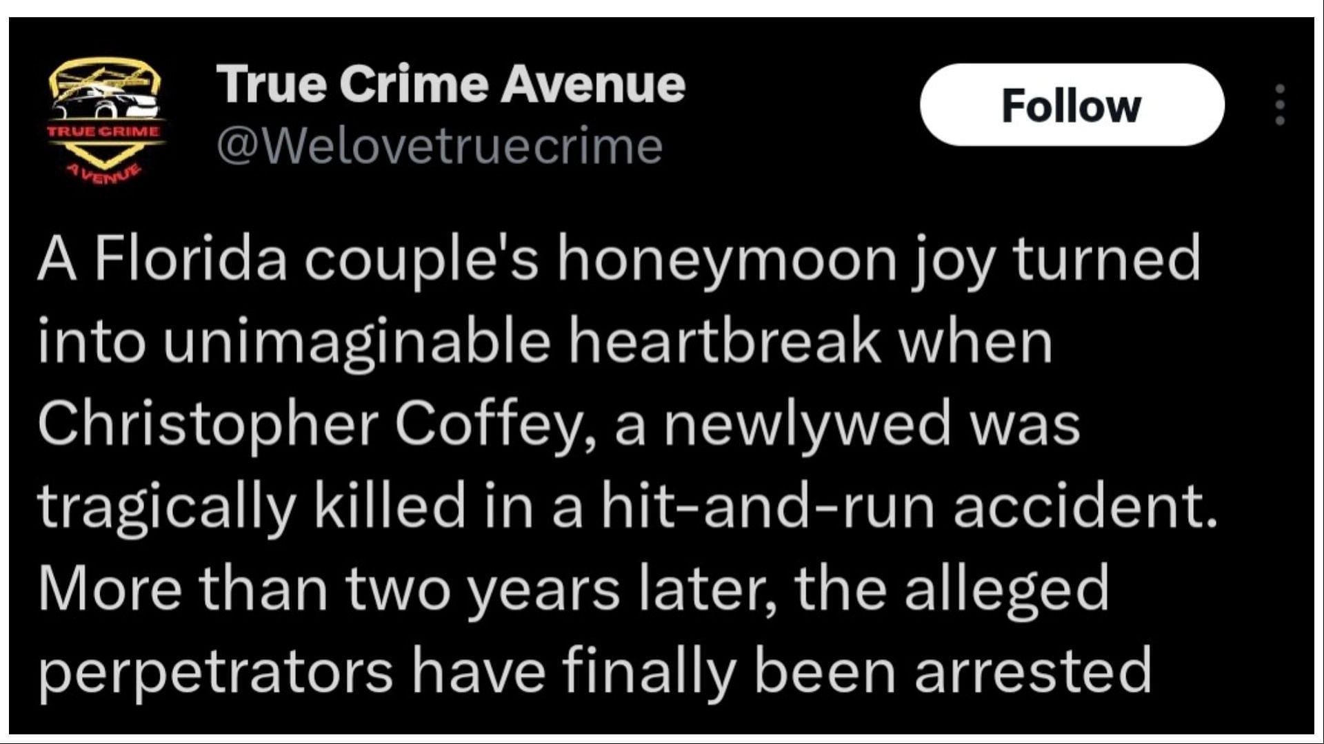 Coffey was with his wife at the time of the crash. While he lost his life, his wife survived but sustained severe injuries.