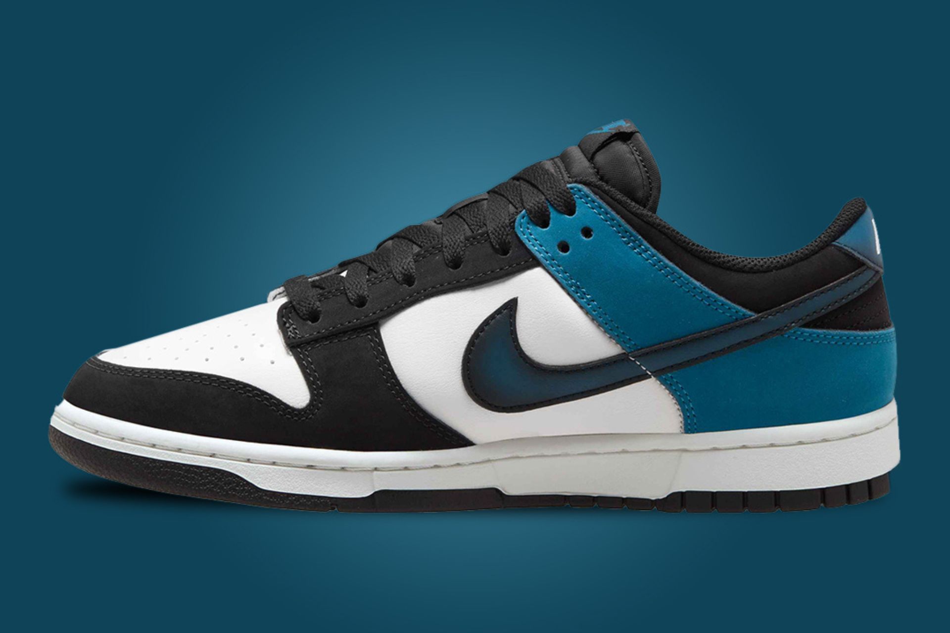 Nike Dunk Low “Black Industrial Blue” shoes are embellished with shaded swooshes