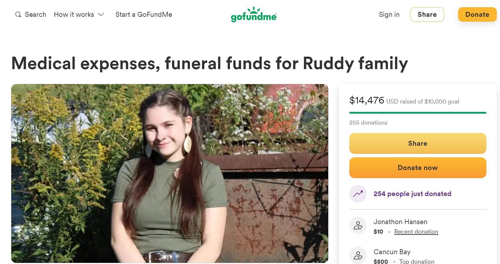 The fundraiser was created to financially support the Ruddy family so that they could cover "medical expenses, funeral costs, and day-to-day living as they grieve and process" the loss of the youngster.