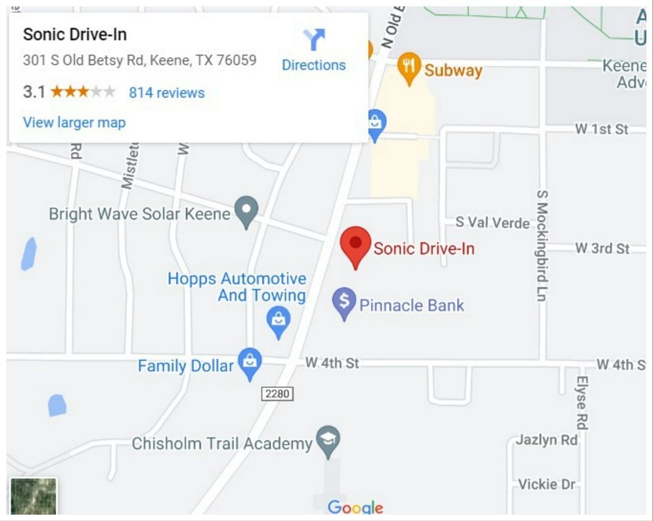 After the shooting incident, the juvenile suspect, who is a resident of Fort Worth, located approximately 28 miles away from Keene, fled the scene along with Gomez. However, the latter made the decision to return to the Sonic drive-in restaurant later that day.