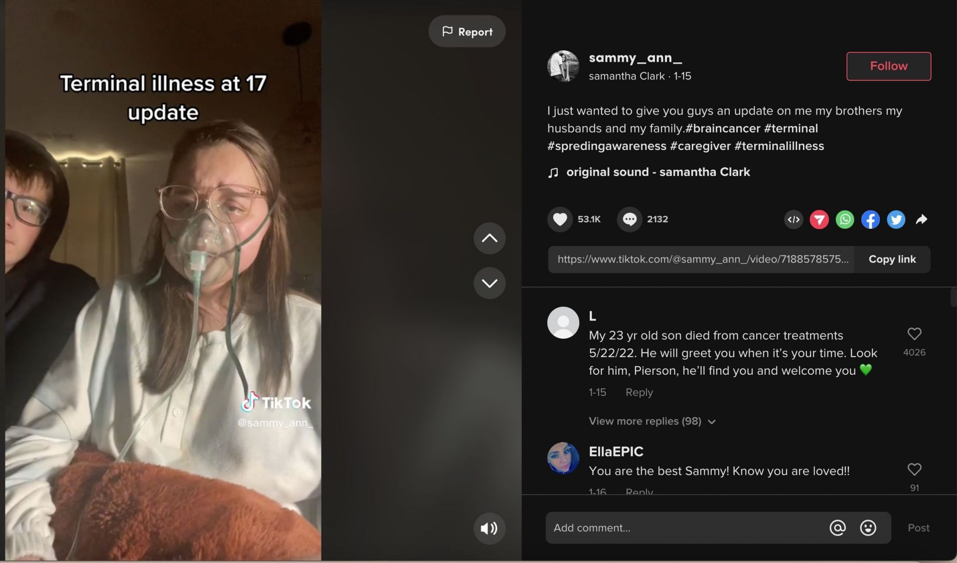 Fans mourn the loss of Samantha Ann Clark as the young TikToker passes away due to terminal brain cancer