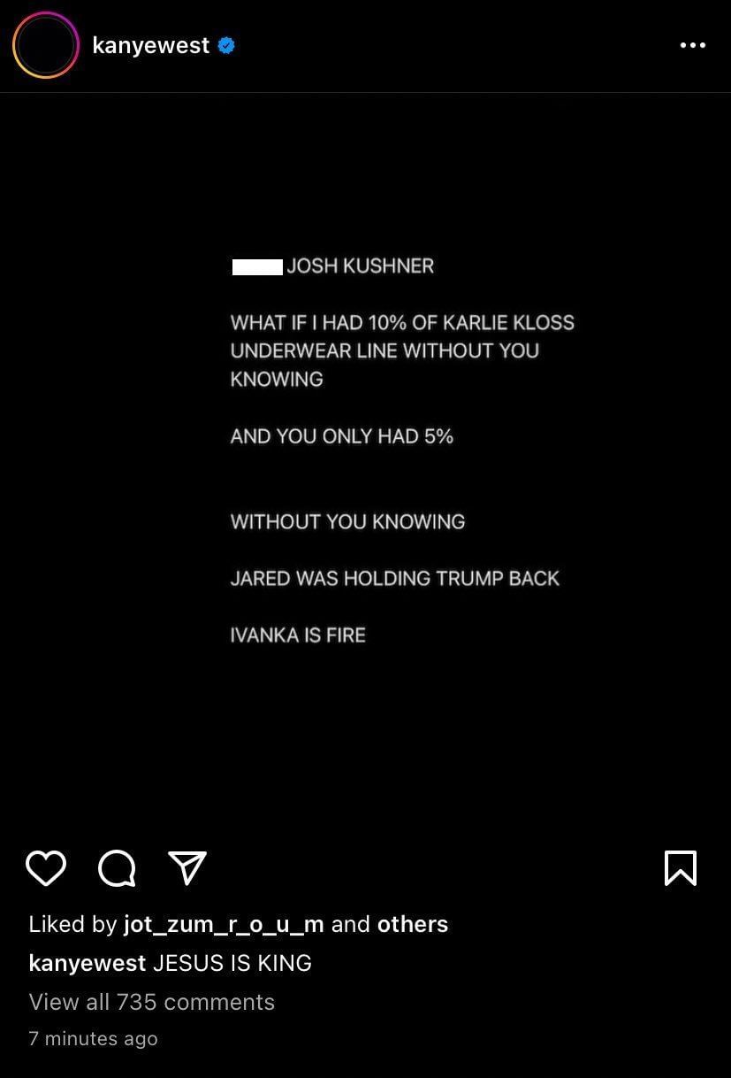 He also teared into Josh’s brother, Jared Kushner, who was the former senior advisor to Donald Trump, Jared Kushner. The rapper claimed that Josh attempted to sabotage Trump’s political administration. Ye even mentioned Jared’s wife Ivanka Trump in his post: