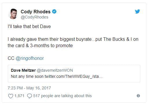It all started in May 2017 when Dave Meltzer commented on Twitter (see below). Cody Rhodes responded positively, and the rest is history. On September 1 2018 Cody Rhodes and the Young Bucks will conduct the All In PPV, it has been sold out for months. The show has received an immense following.
