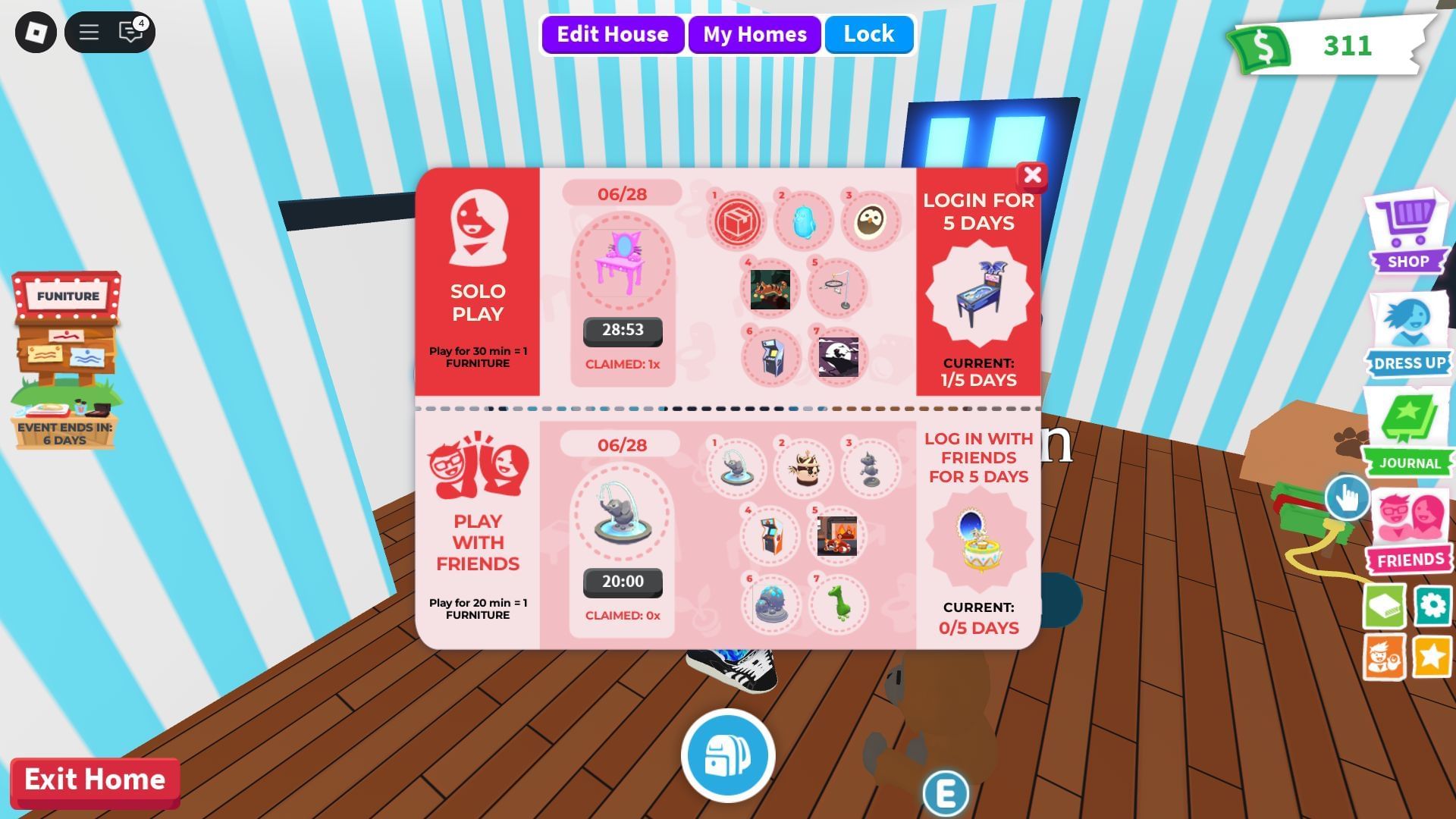 The Furniture Delivery update is primarily about giving all players access to various pieces of furniture across a period of seven days. This update includes two types of login rewards: Solo Rewards and Play with Friends Rewards. Starting from June 27, 2025, a new kind of furniture is set as the featured item of the day for each type. Once the day ends, a new item takes its place, making each inclusion available for 24 hours only.
