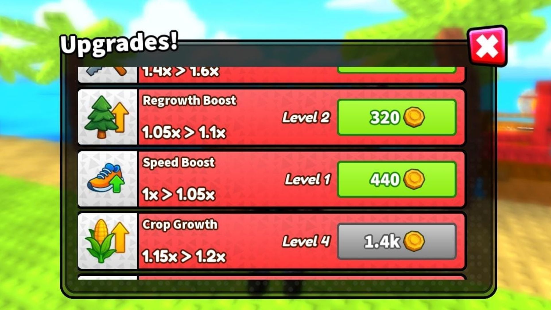 While every crop has a preset growth time, you can speed it up with upgrades. Each investment in the "Crop Growth" upgrade boosts a crop's growth by 0.05%. You can also spend Gold in the "Regrowth Boost" upgrade for greater yield efficiency in the game.
