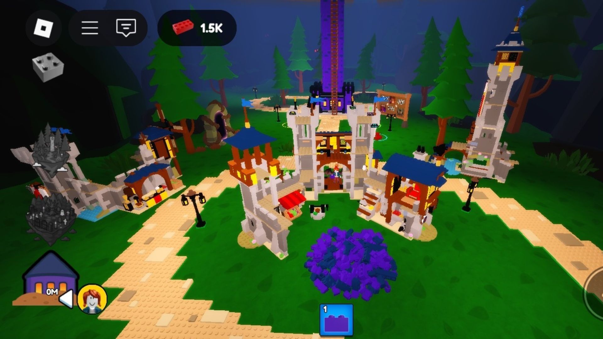 As you enter the game arena, you'll see a spooky purple-colored castle, which is the Haunted Tower building. Players will build their tower on top of that to reach higher and collect the Golden Brick. Upon climbing and jumping from the tower, players will get bricks, which serve as the currency during this event.