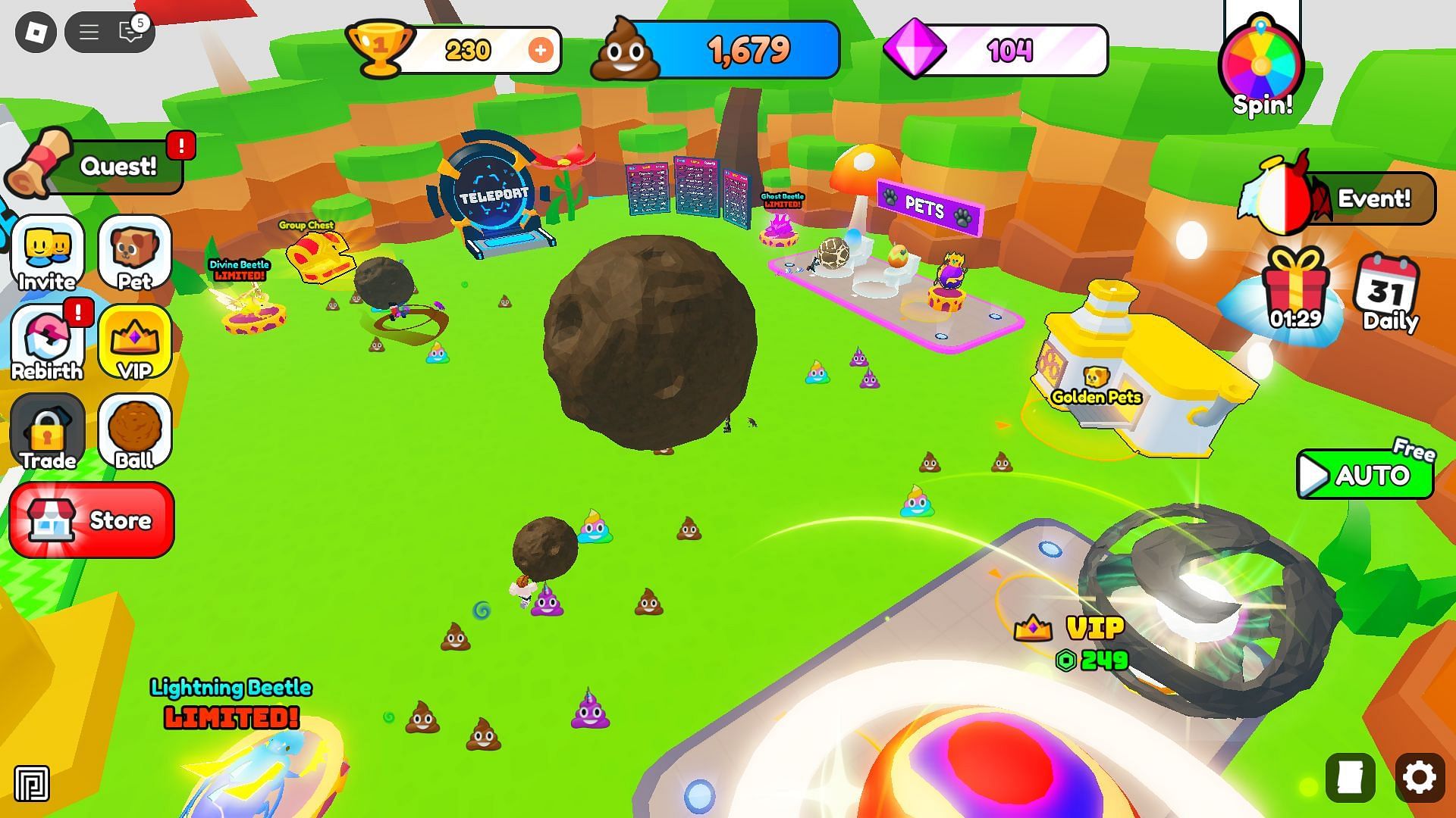 - Rebirth: With the help of your accumulated Wins, you can Rebirth your dung ball. Doing so will reduce it to zero but at the same time, it will also get an increased poo-poo gains.