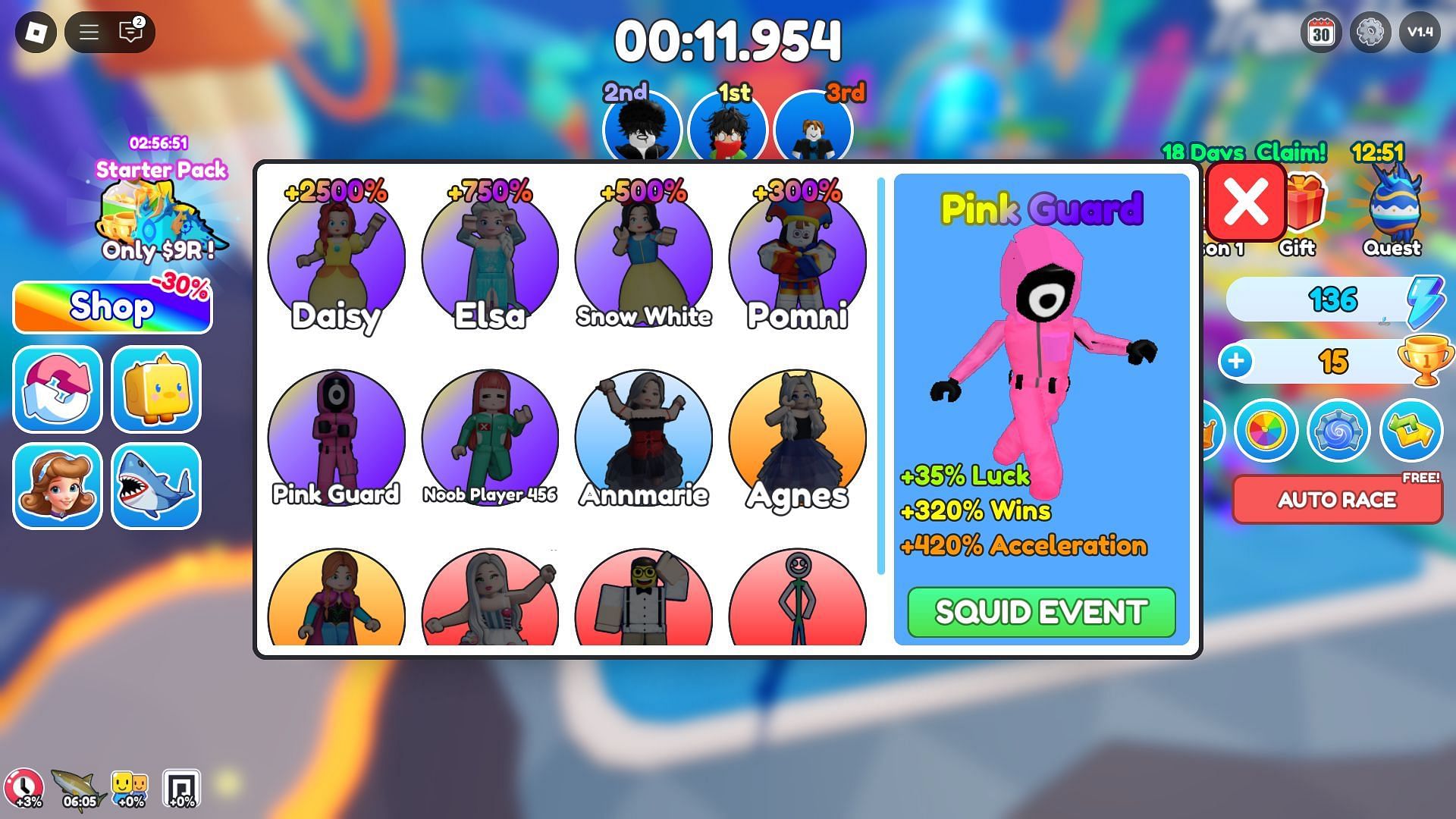 - Partners: Partners are NPCs that boost your Acceleration, Luck, and Win acquisition rate. These can be unlocked through Wins and can be instrumental in clearing races. You may also purchase them for Robux if you wish to circumvent the grind.